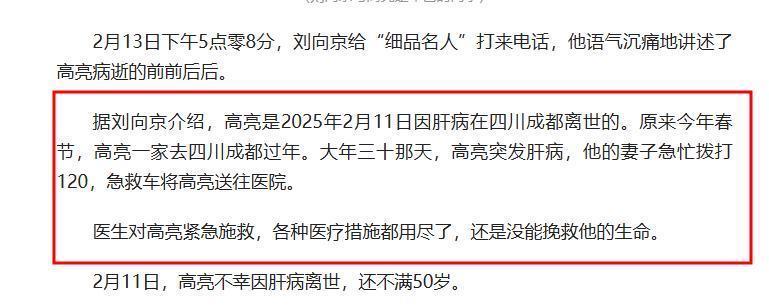 在刘向京发布讣告之后,自媒体博主“细品名人”联系了他,得知了高亮去世的前前后后。